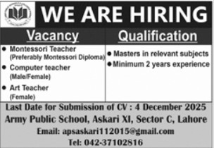Candidates, if you are seeking Army Public School Lahore Jobs 2025 Online Application yes. then it would help if you tried to complete the Army Public School Lahore Jobs because here you can easily apply for these vacancies: Montessori Teacher (Preferably Montessori Diploma), Computer teacher (Male/Female), and Art Teacher (Female).